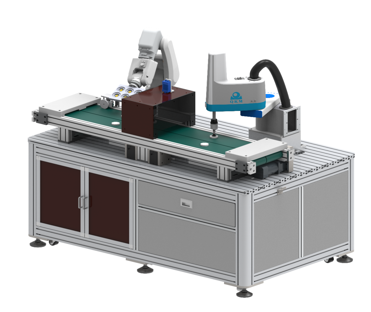 伴随计算机、智能相机等技术的不断发展,机器视觉技术愈发成熟,给机器人加上视觉,就如同让机器人有了眼睛,可以大大提高机器人的工作精度和准确性。在该工作站中,首先,智能相机将拍摄得到的信息传递给Scara机器人,让Scara机器人准确知道工件的位置,提高了抓取精度。然后Scara机器人将抓取到的工件放置在小六轴机器人末端带有传感器的托盘中,一旦托盘中摆满工件,Scara机器人便会停止抓取工作。同时,小六轴机器人会将托盘中的工件重新倾倒到传送带上,形成一个循环的工作流程。