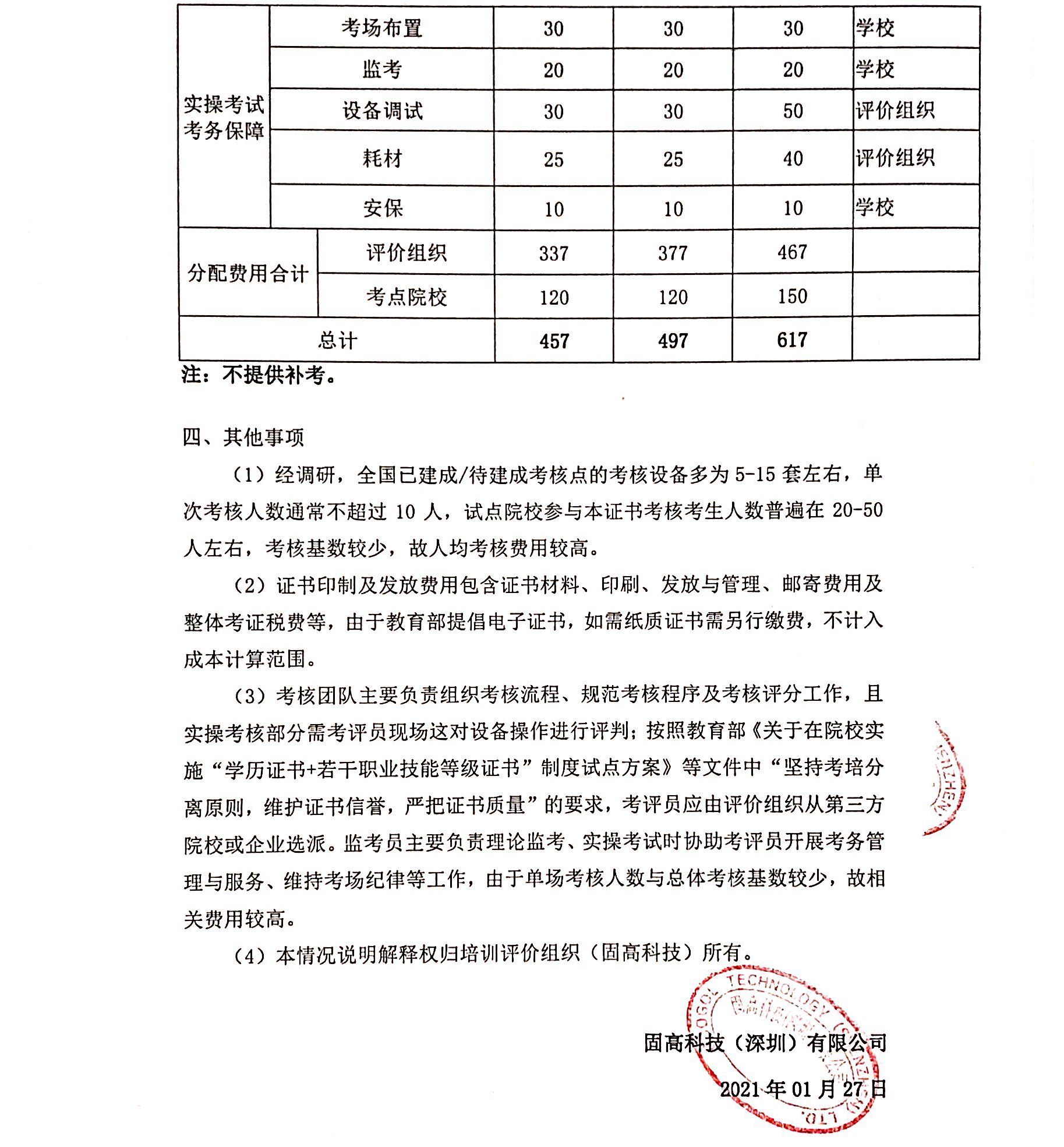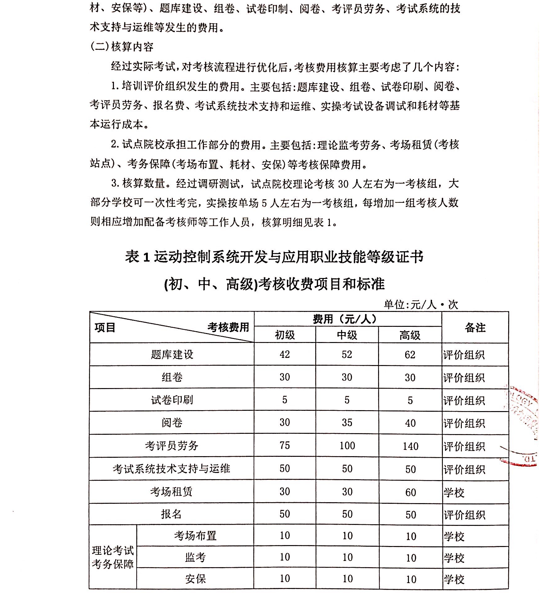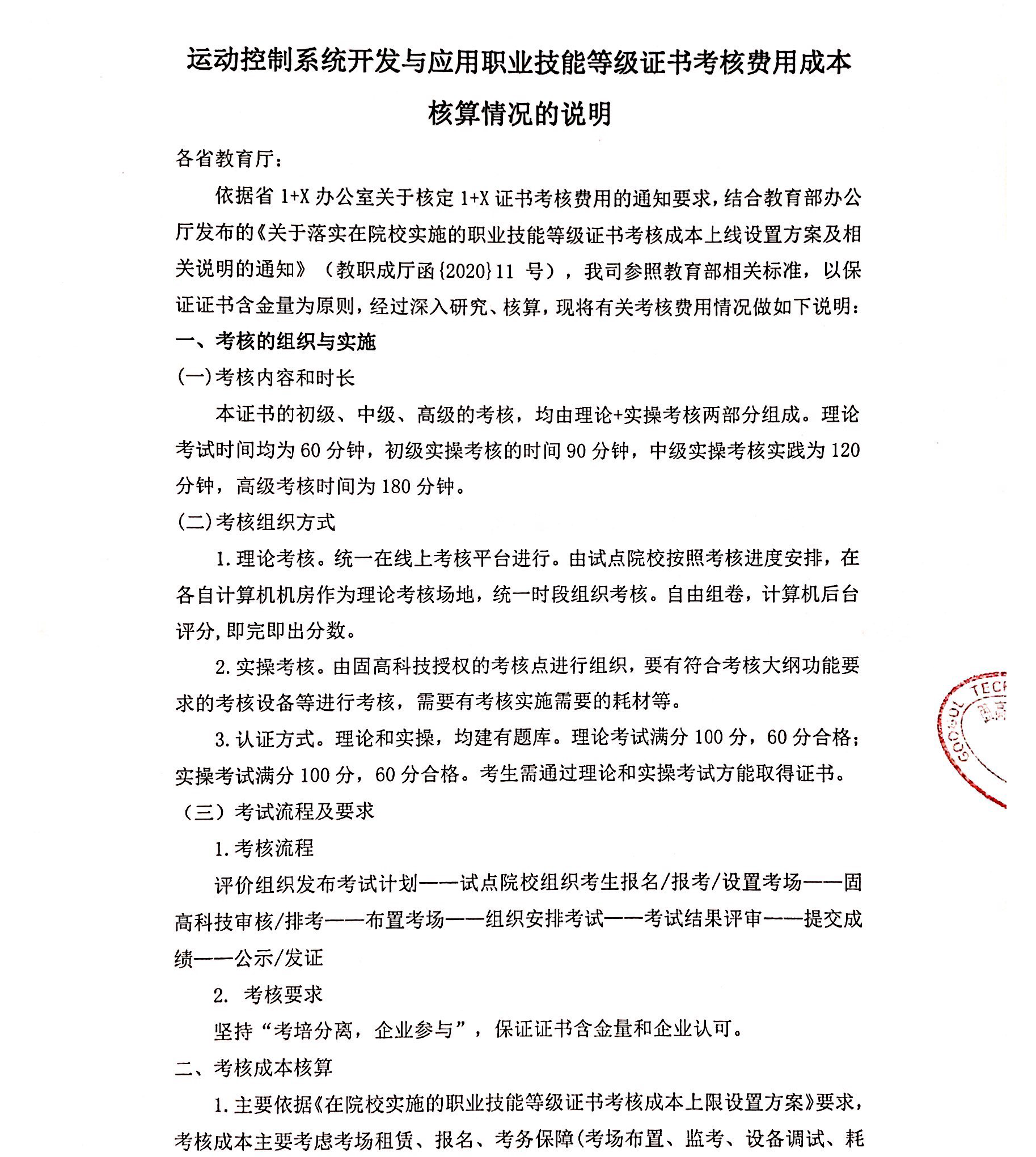 运动控制系统开发与应用职业技能等级证书考核费用成本核算情况的说明