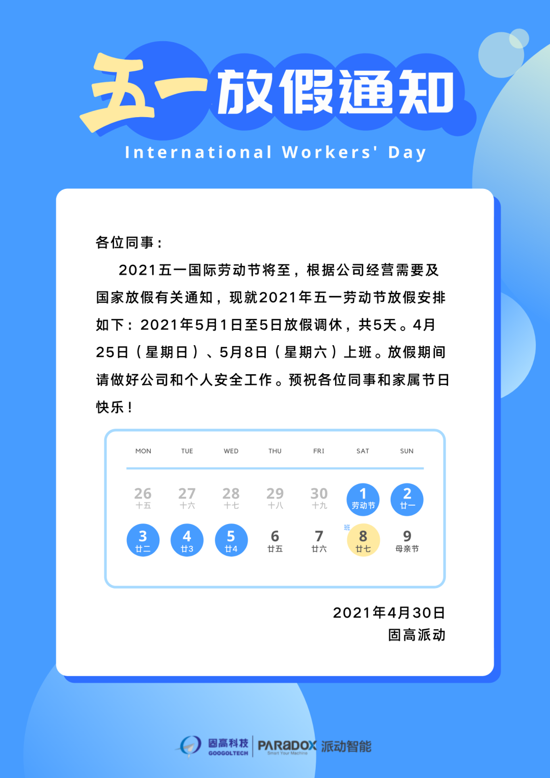 固高派动2021五一国际劳动节放假通知!